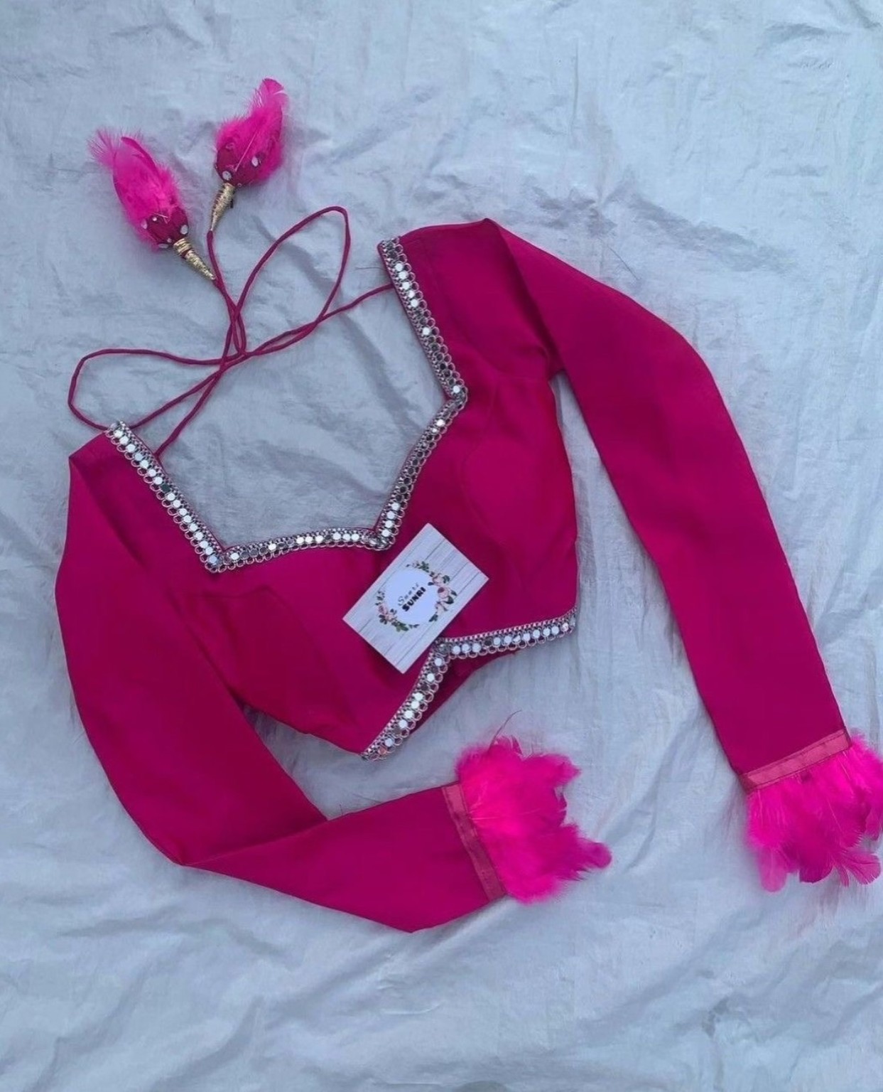 Sleeves ke end par feather (fur) detailing blouse ko unique aur premium touch deti hai. Back side me dori with tassels diya gaya hai jo adjustable aur stylish look deta hai.